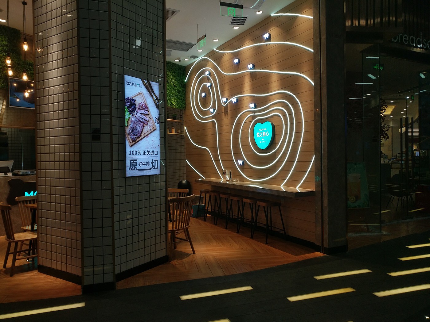 海晨為牧之初心-原切牛排制定了整套的解決方案,其中不僅僅只是有燈箱的部分,而是包括了整個(gè)店面需要用到的一切廣告展示用品。從設(shè)計(jì)、生產(chǎn)、安裝到售后服務(wù)一體化,為客戶解決問(wèn)題的整體解決方案。