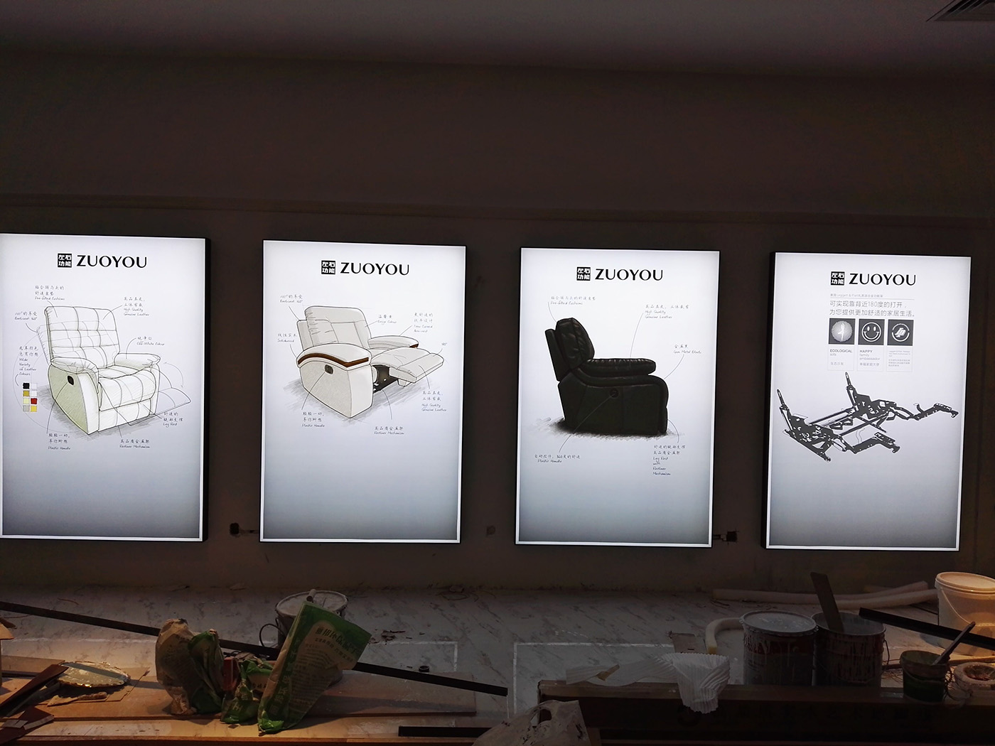 海晨為左右沙發(fā)制定了整套的解決方案,其中不僅僅只是有燈箱的部分,而是包括了整個(gè)店面需要用到的一切廣告展示用品。從設(shè)計(jì)、生產(chǎn)、安裝到售后服務(wù)一體化,為客戶解決問題的整體解決方案。