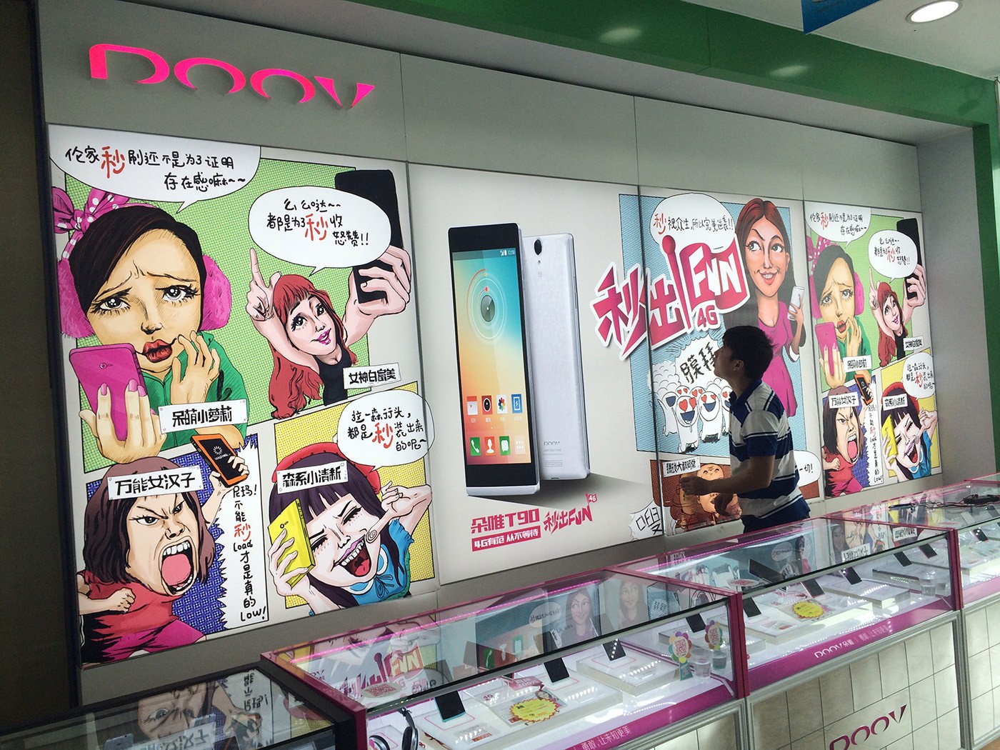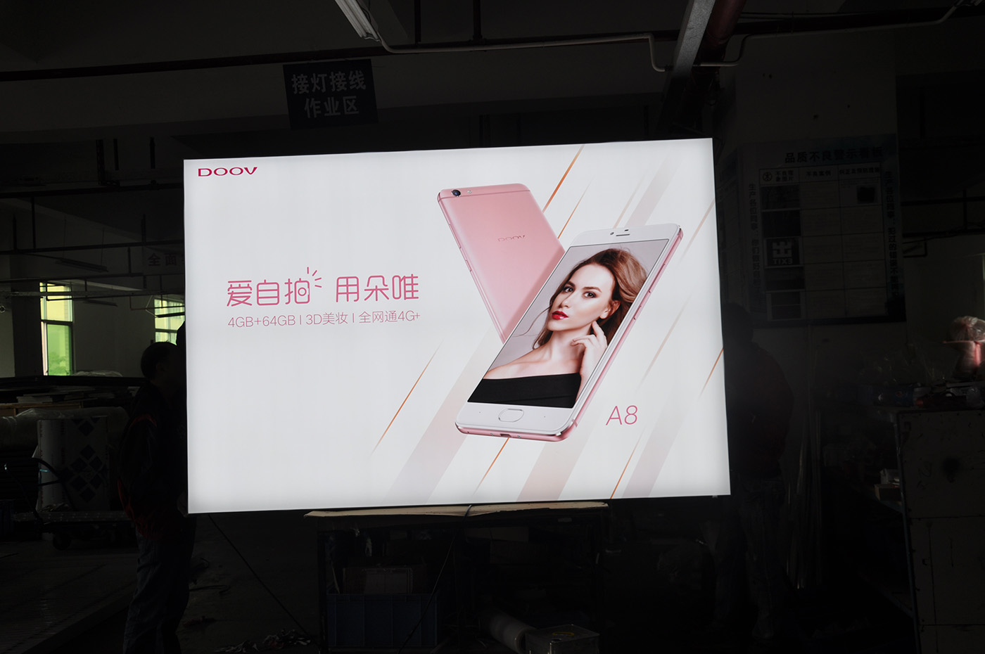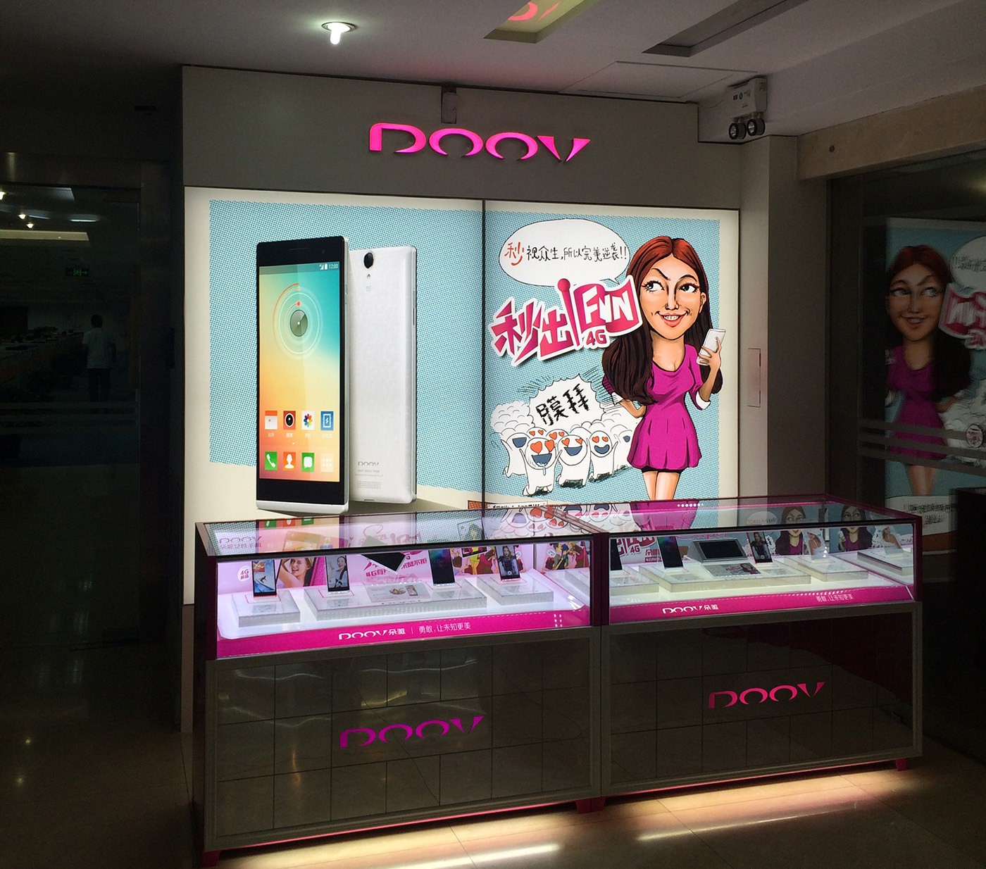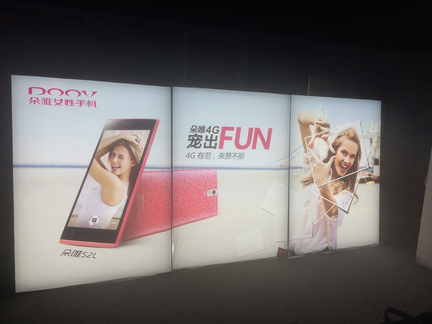 海晨為朵唯手機制定了整套的解決方案,其中不僅僅只是有燈箱的部分,而是包括了整個店面需要用到的一切廣告展示用品。從設計、生產、安裝到售后服務一體化,為客戶解決問題的整體解決方案。